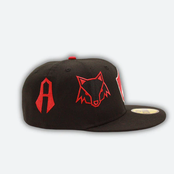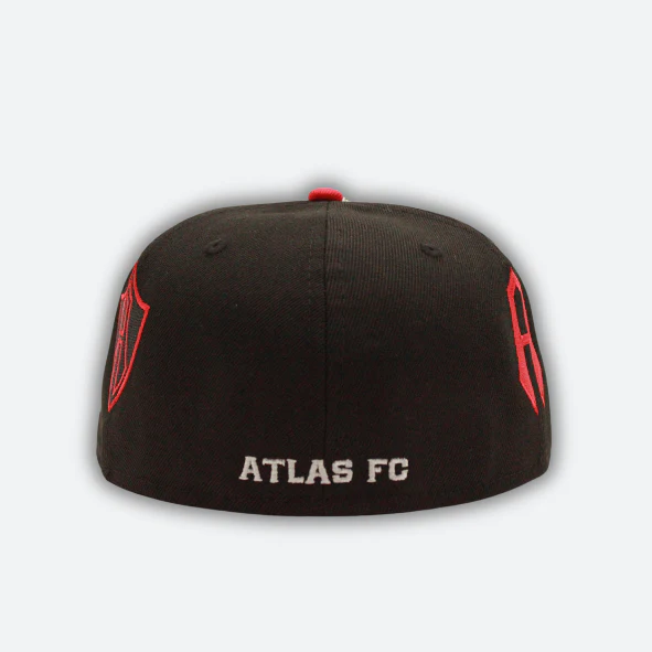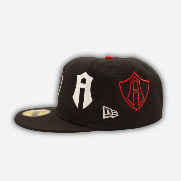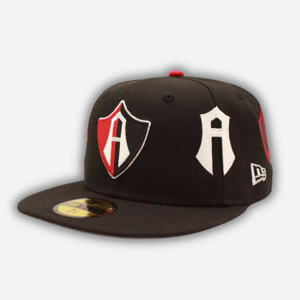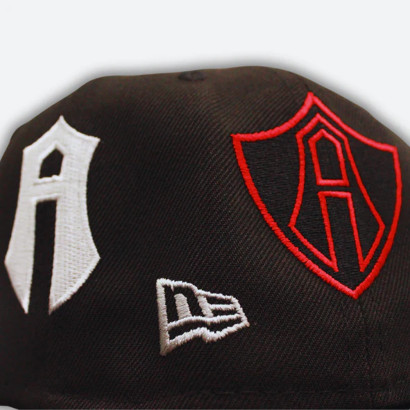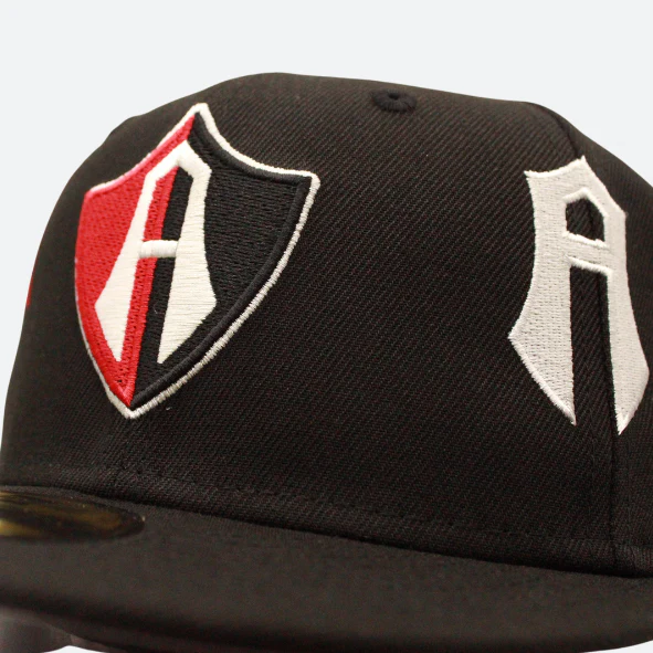 Gorra New Era 59FIFTY de ATLAS FC de la colección Stencil Collection presenta los diferentes escudos del equipo a lo largo de su historia y la bandera de New Era bordada en el lado izquierdo.