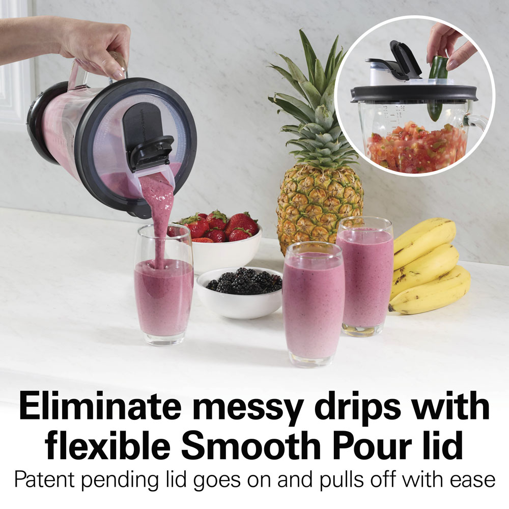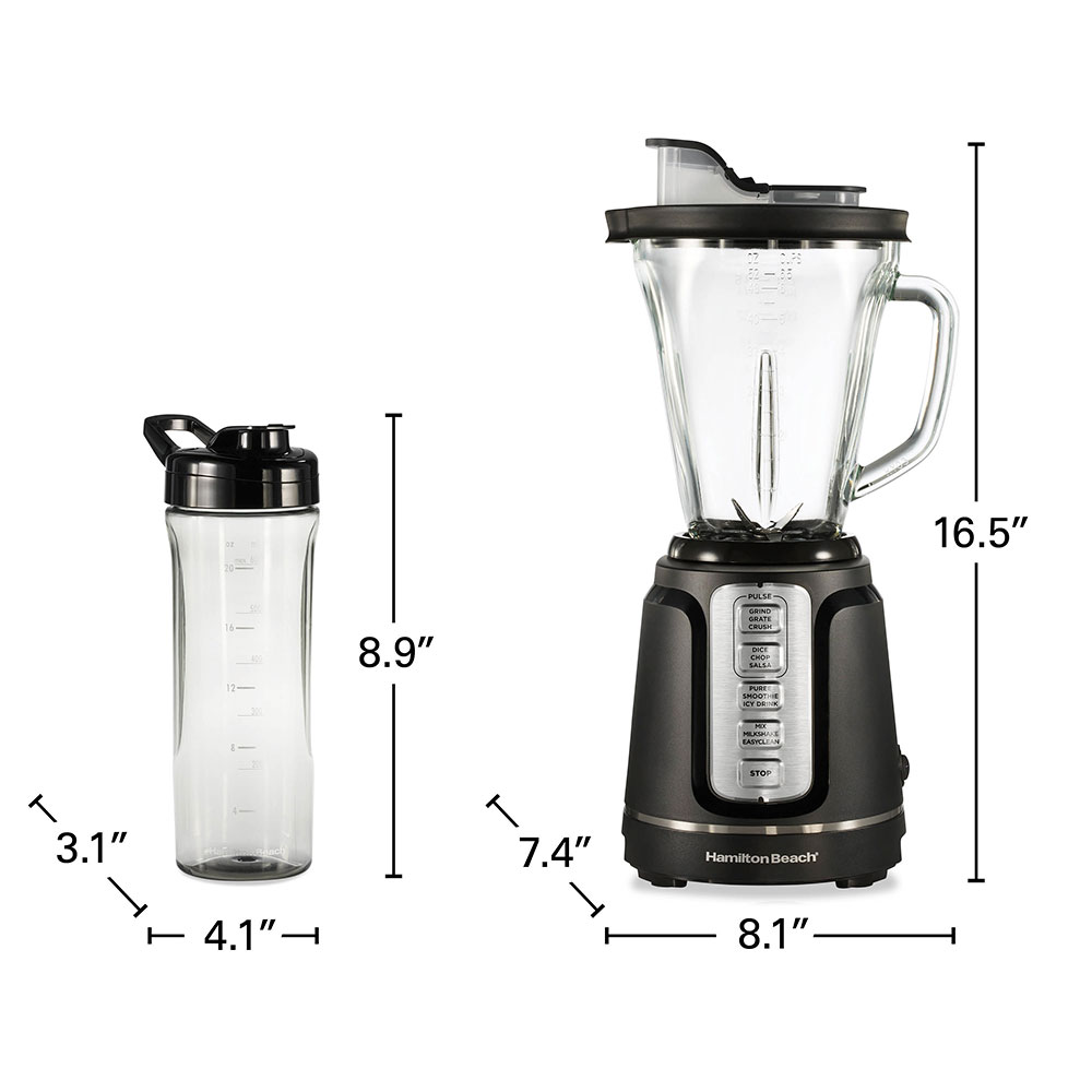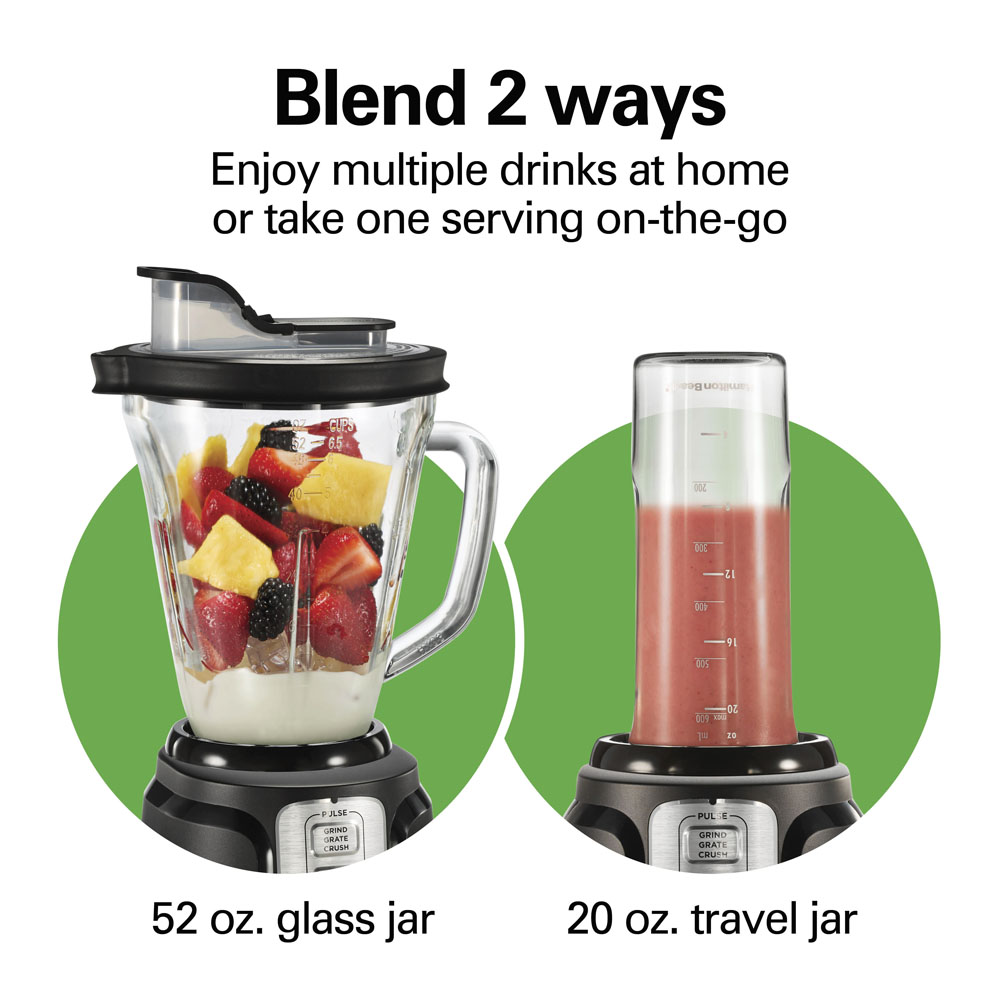 Blend Two Ways— big batches at home or single servings to go—with the Hamilton Beach® PowerBlend Duo. The 52 oz. Multiblend® durable glass jar and tamper are designed to smoothly blend everything from hummus and salsa to icy drinks or hot soups. The extra-large capacity means enough space to blend for family and friends without having to make several batches. Blend directly in the 20 oz. BPA-free travel jar to make individual servings of smoothies, shakes and more to take on the go.