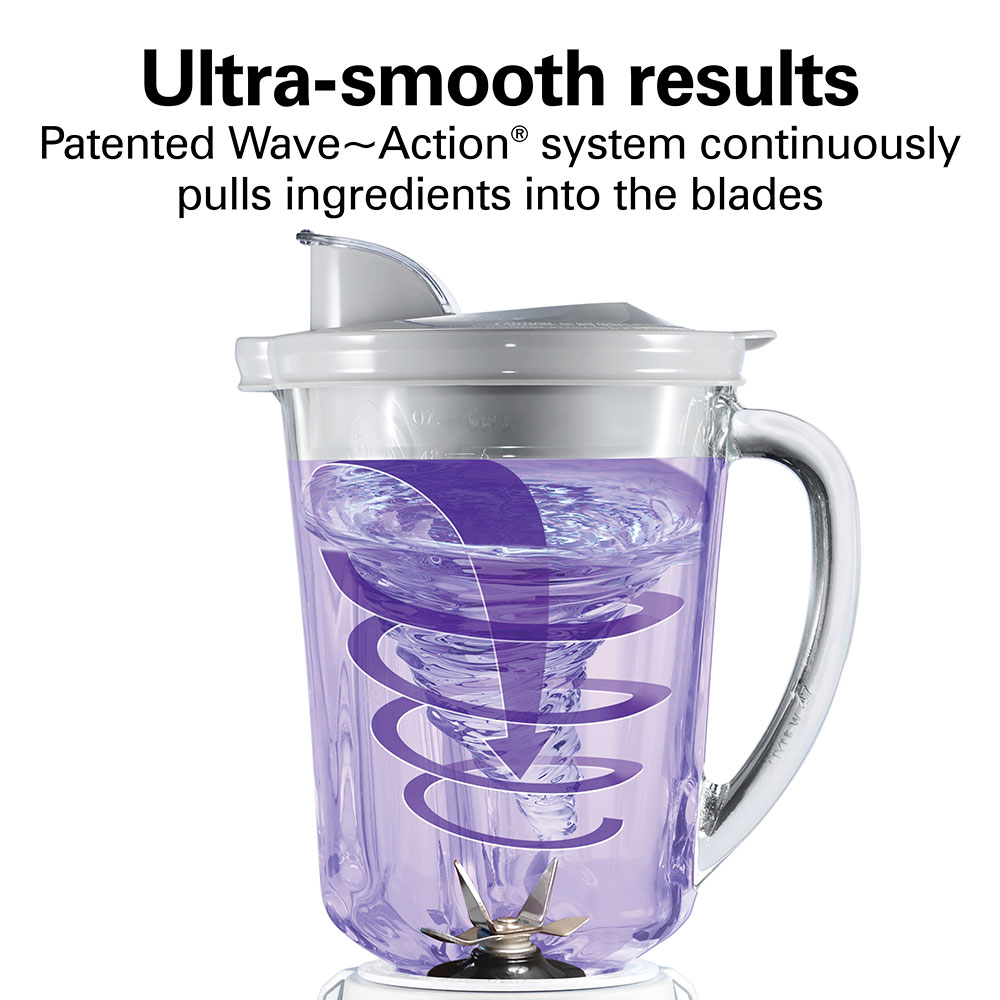If healthy smoothies, protein shakes and icy drinks are an important part of your lifestyle, the Hamilton Beach® Wave~Action® Quiet Blender is the tool you need in your kitchen. Powered with ice-crushing stainless steel Ice Sabre® blades and an 800 watt peak- power motor, it makes quick work of blending delicious drinks. The patented Wave~Action® System continuously pulls ingredients down into the blades and circulates them around the jar — thoroughly crushing ice, frozen fruit, leafy greens and hard foods for ultra-smooth results.