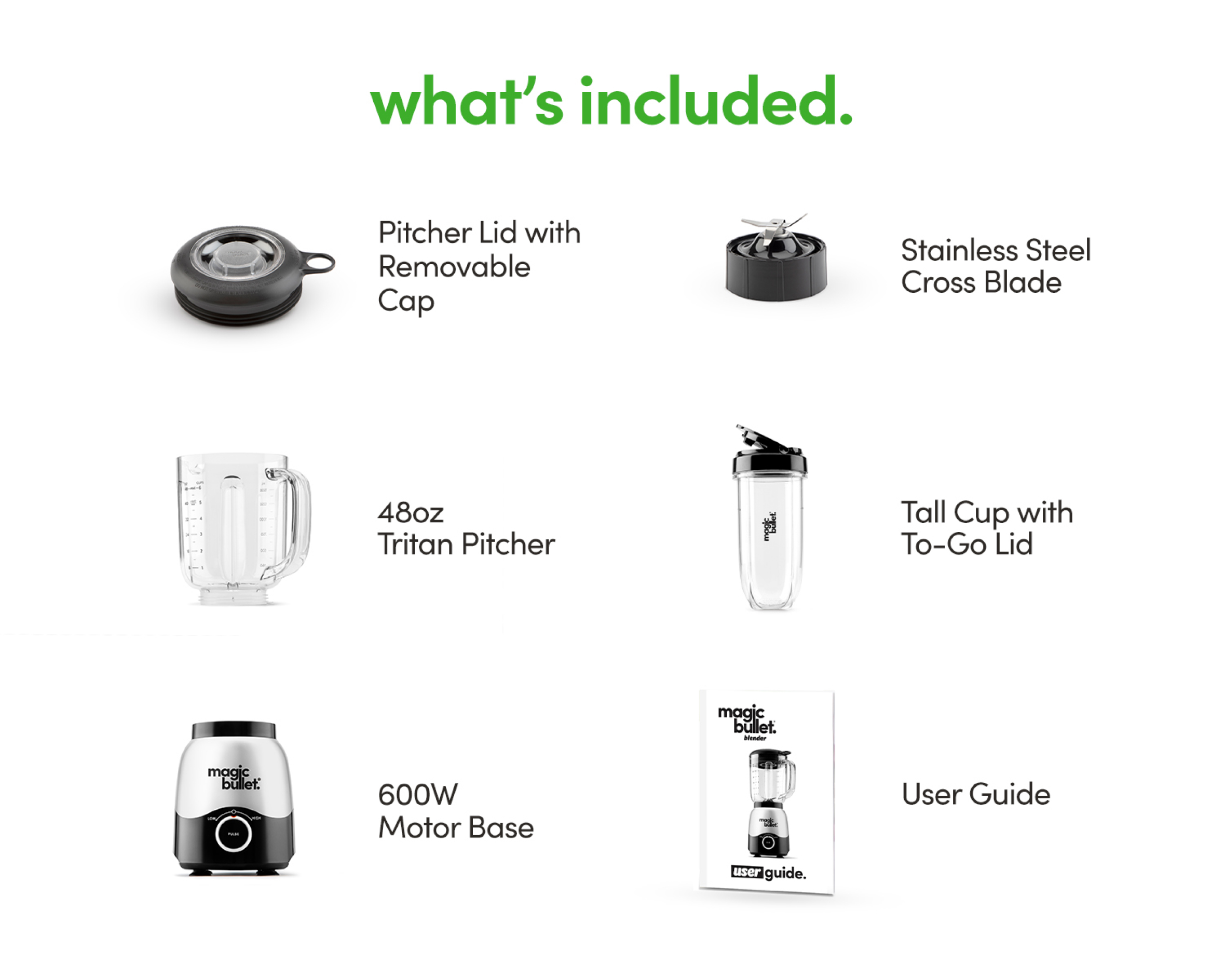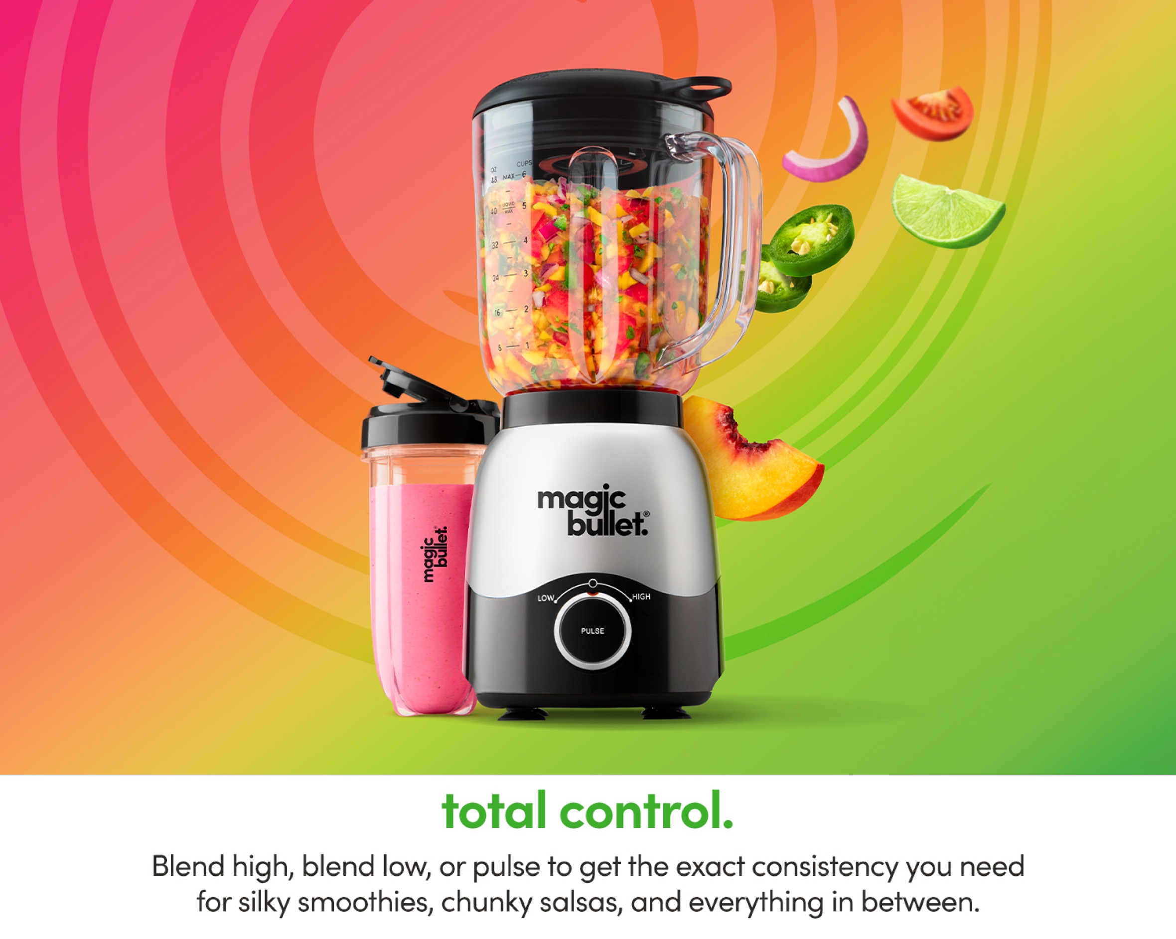 Whether you’re prepping a big batch of your favorite smoothie or frozen drinks for a crowd, this blender has you covered with a 48oz vented pitcher and 500-Watt motor base (the most powerful of any magic bullet®) It’s also super easy to operate, with a simple dial that gives you full control over the speed and duration of your blends.With the magic bullet® Blender, you’ve got the goods to make ample amounts of blended deliciousness with style, ease, and a whole lot of magic.