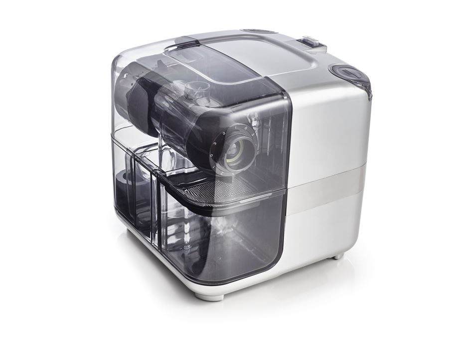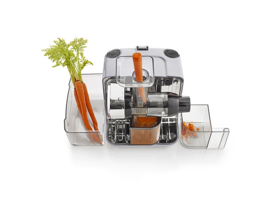 All the parts of this modular juicer pack neatly into itself to present a pleasing curve-cornered cube when not in use. The dual stage auger system gives a very respectable juice yield and the blank homogenising screen and extra nozzle set turn it into a versatile nutrition centre offering access to nut butters, fruit sorbets, healthy baby foods and more.