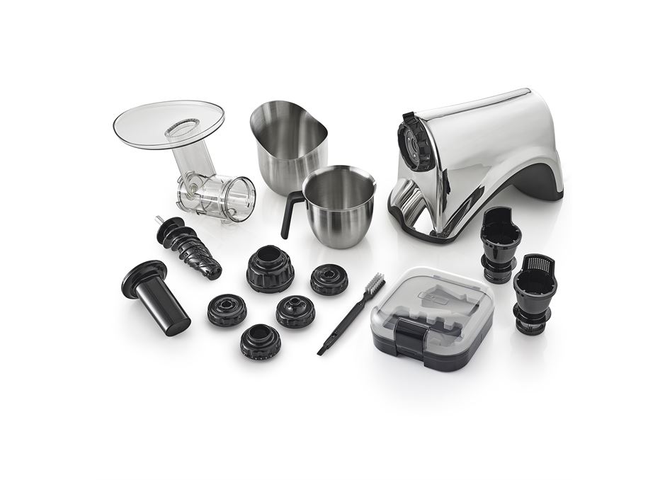 The added durability and beauty of the polished stainless motor housing will appeal to many, and this juicer is especially suited to those who juice a lot of leafy green veg, as well as giving great results with all other juicing ingredients. The homogenising accessories add the ‘nutrition centre’ title to this juicer, allowing you to make nut butters, sorbets, salsa, noodles and more.