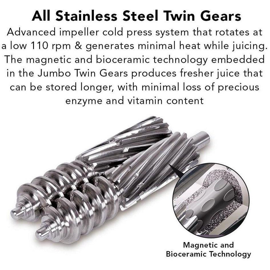 The NEW all Stainless-Steel Jumbo Twin Gears are an advanced impeller press system that rotates at a low 110 RPM, generating reduced heat while juicing. The gears also have embedded magnetic and bio-ceramic technology that helps produce stable, fresher juice. This combination allows longer juice storage with less loss of enzyme and nutrient content.