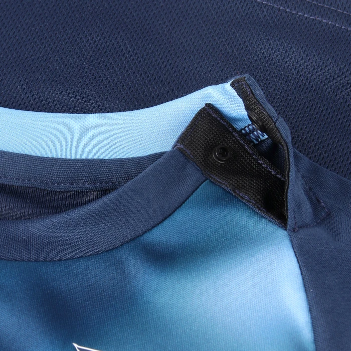 Maglia – pannello frontale sublimatico con retro in mesh e maniche raglan lisce. Colletto a girocollo e polsini in tessuto tono su tono. Aperture sagomate alle maniche raglan con 2 bottoni automatici su entrambi i lati del colletto. Nastro interno collo semplice. Stemma principale del club e logo Mizuno applicati a caldo su petto e maniche, con scritta “9 GENNAIO 1990” sul retro del collo.