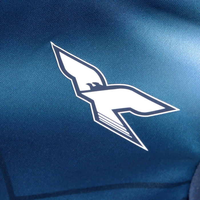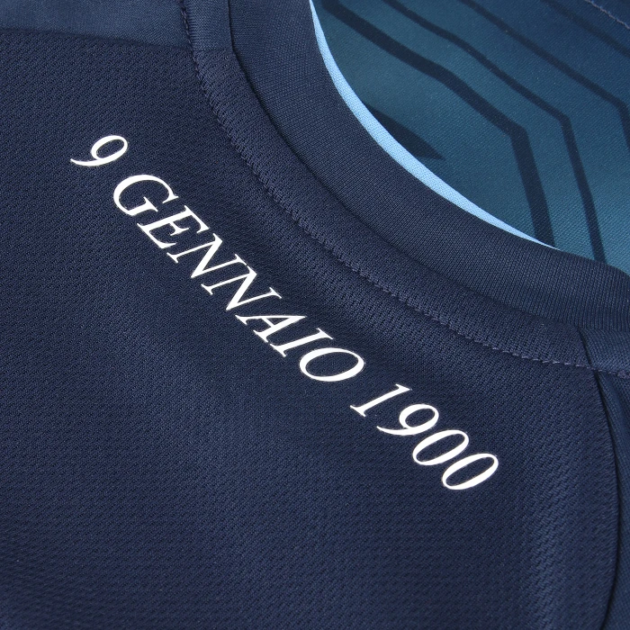Maglia – pannello frontale sublimatico con retro in mesh e maniche raglan lisce. Colletto a girocollo e polsini in tessuto tono su tono. Aperture sagomate alle maniche raglan con 2 bottoni automatici su entrambi i lati del colletto. Nastro interno collo semplice. Stemma principale del club e logo Mizuno applicati a caldo su petto e maniche, con scritta “9 GENNAIO 1990” sul retro del collo.