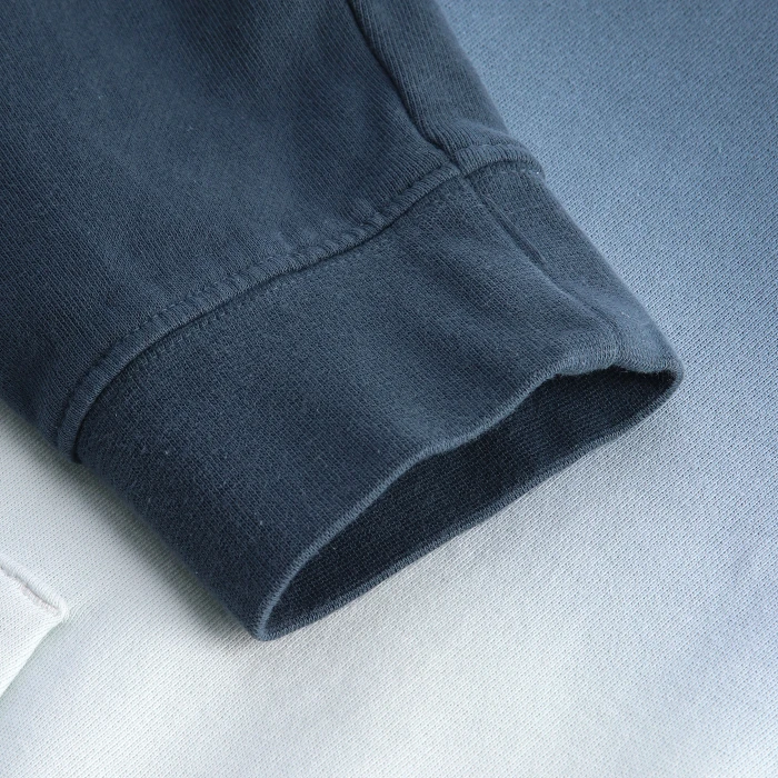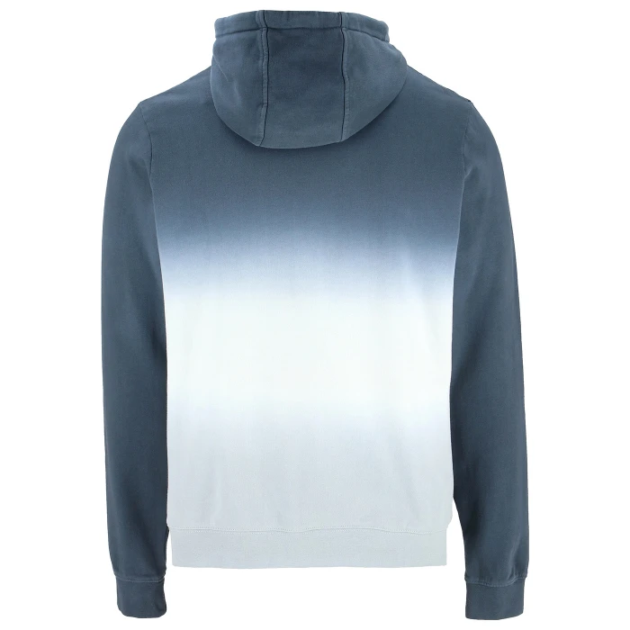 Felpa con cappuccio con effetto sfumato su tutta la parte anteriore e posteriore del corpo. Cappuccio in 3 sezioni completamente foderato, con coulisse piatta passante attraverso occhielli in metallo sul davanti. Nastro interno collo posteriore in tinta unita. Spalle avanzate con cuciture a vista. Tasca a marsupio sul fondo anteriore con cuciture decorative.
