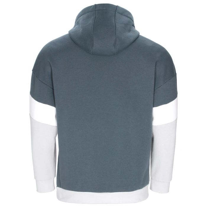 Felpa con cappuccio con pannelli tagliati e cuciti a contrasto sul davanti e sulle maniche. Schiena e cappuccio in tinta unita, con coulisse piatta passante attraverso occhielli in metallo. Tasca a marsupio a contrasto sul fondo del capo. Polsini e orlo inferiore a costine.