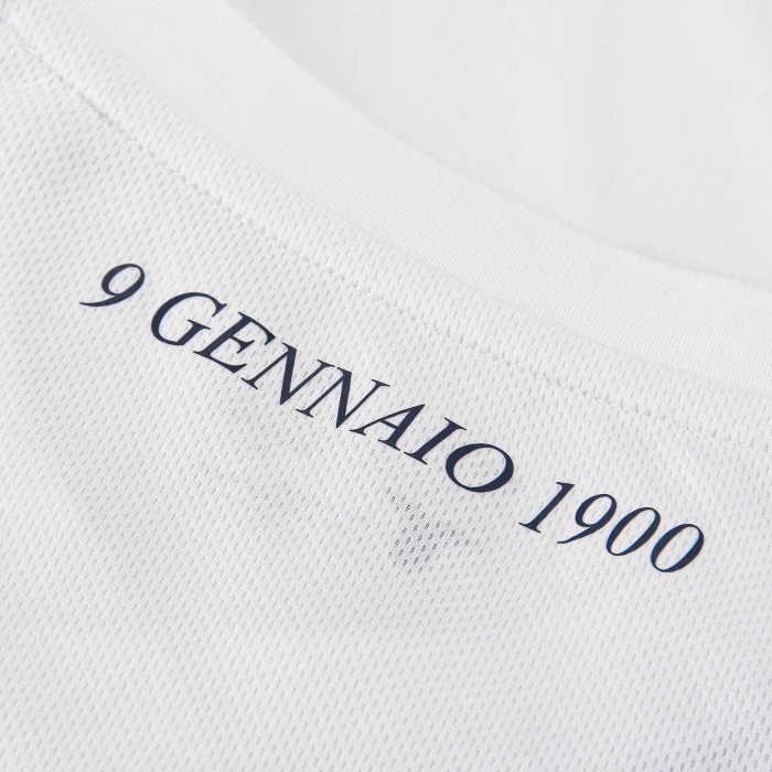 Questa maglia Home celebra il 125 anniversario della S.S. Lazio, ispirandosi alle tendenze degli anni 70 e 80 e riportando alla luce lo stemma del club di quellepoca. La maglia è composta da un mix di corpo anteriore in rilievo e strisce sublimate sul lato anteriore, retro in tessuto a rete e maniche in tinta unita. Collo a V in tinta unita e bordi delle maniche a righe. La scritta 9 GENNAIO 1900, trasferita a caldo, si trova sul retro del collo. Scritta posteriore a tinta unita sul collo. Composizione: Vestibilità standard 100% poliestere riciclato.