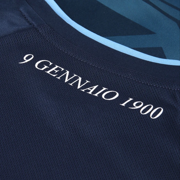 Maglia – pannello frontale sublimatico con retro in mesh e maniche raglan. Colletto a “V” e polsini in tessuto tono su tono. Nastro interno collo semplice. Stemma principale del club e logo Mizuno applicati a caldo su petto e maniche, con scritta “9 GENNAIO 1990” sul retro del collo.