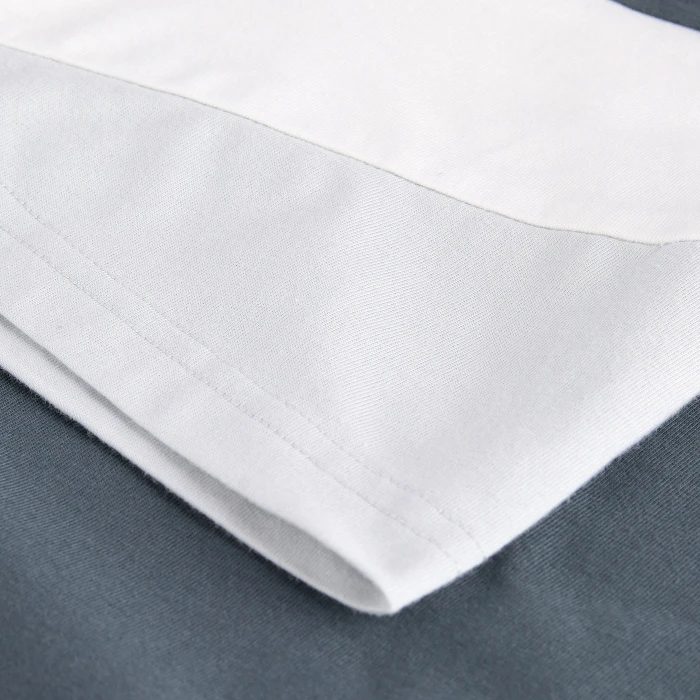 T-shirt a maniche corte con pannelli a contrasto tagliati e cuciti sulle maniche. Parte frontale, posteriore e girocollo in tinta unita, con nastro interno collo posteriore in tinta unita.