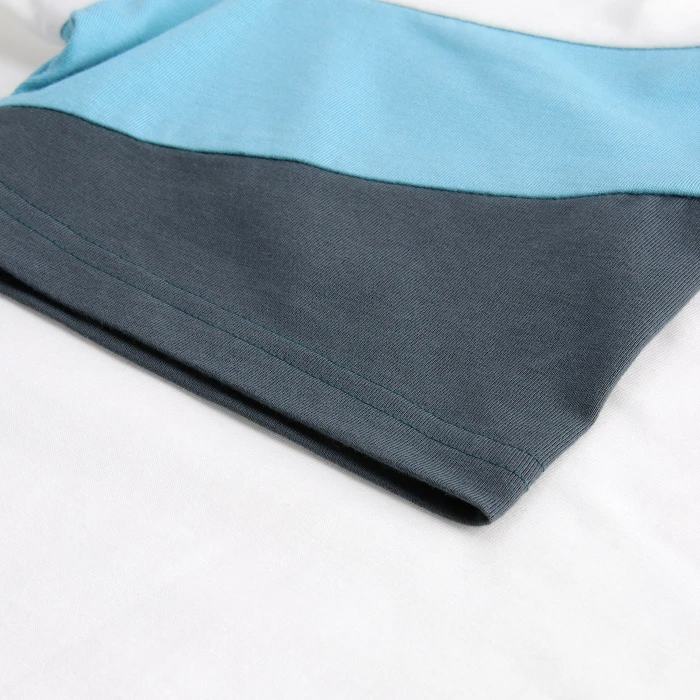 T-shirt a maniche corte con pannelli a contrasto tagliati e cuciti sulle maniche. Parte frontale, posteriore e girocollo in tinta unita, con nastro interno collo posteriore in tinta unita.