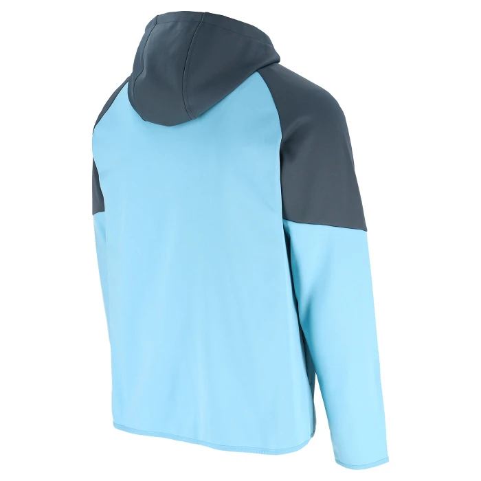 Felpa con cappuccio con parte anteriore, posteriore e maniche inferiori in tinta unita, e pannelli a contrasto sulle maniche raglan superiori e sul cappuccio. Cappuccio completamente foderato, con nastro interno collo in tinta unita. Zip frontale intera con garage e protezione interna. Cuciture sagomate sul davanti con tasche coperte, zip rovesciate e cursori di sicurezza.