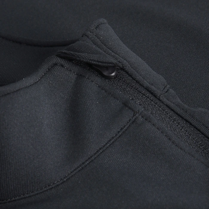 Zip rovesciata sulla spalla con cursore bloccabile, garage e protezione interna. Polsini con bordo elastico e orlo dritto sul fondo del capo.